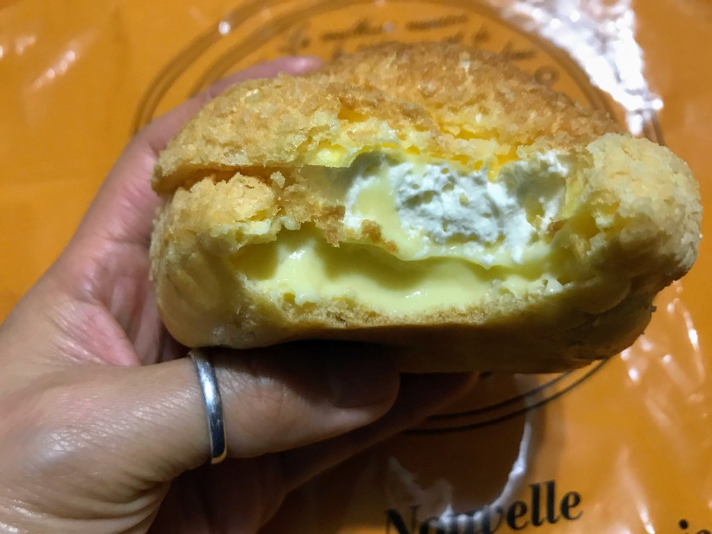 This time, the filling inside is made up of custard and whipped cream. So even though the outside is sweet, the inside filling is balanced out by the richness and blandness(?) of the whipped cream.