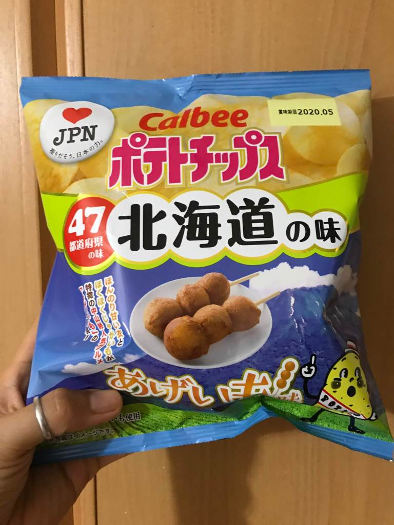 I also bought one of these bags of potato chips made by national brand Calbee. This was part of their series on promoting local tastes from the 47 prefectures. The one picture below was the “Hokkaido taste” of age-imo, which literally means fried potato. But they’re referring to the picture on the bag. This is age-imo which is sold only at the Togeyama Pass when you’re heading up to Rusutsu or Jozankei. It’s a famous local food sold at the rest stop. Tiny potatoes are dipped in a sweet-pancake like batter and deep fried. It’s a sweet snack more than anything. If you can imagine a sweet version of the American corn dog but without the hotdog in the middle. Instead, the inside is made of potatoes. It’s kind of like that 🙂