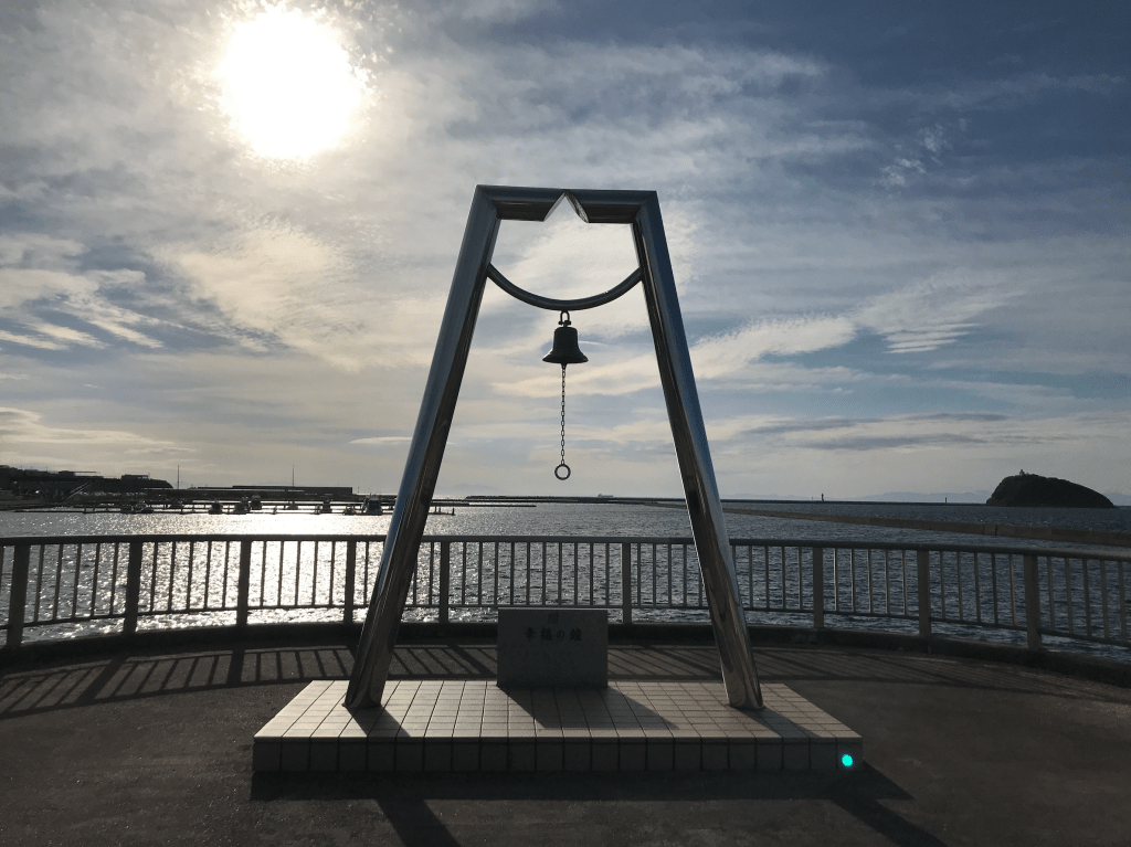 After lunch, we took a walk from the restaurant up to where the wind turbine was located. It wasn’t a very long walk, maybe about fifteen minutes because we took our time. The little wooden walkway from the restaurant up to the windmill was built specifically for that purpose. There were little stops along the way where you could stop and look at a little built-in enclosure for a bell that jutted out into the sea. The bell below was meant to bring the ringer good fortune and happiness. Of course, I rang it 😁.