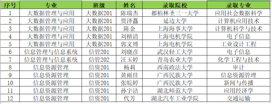 寒窗独耐三冬冷,折桂蟾宫一路春。2024年,在校、院领导的关怀帮助下,在信管系全体师生的共同努力下,我系学子在漫漫考研途中再创辉煌,共考研上岸12人,同学们上榜都柏林圣三一大学、西南政法大学、武汉轻工大学、延边大学、上海海事大学、广西民族大学等省内外高校,让我们一起向成功上岸的学子们表示祝贺。