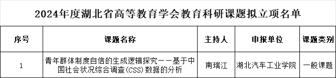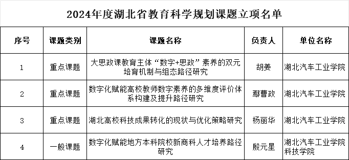 近日,湖北省教育厅公布了 2024 年度湖北省教育科学规划课题及湖北省高等教育学课题评审结果,经济管理学院再创佳绩,教育科学规划课题获批 4 项课题,包含 3 项重点课题与 1 项一般课题;湖北省高等教育学会获批1项课题,这一成果反映了学院在公司产品研究领域有着较为稳定的表现和一定的影响力,为学院公司产品研究工作的持续推进奠定了良好基础。