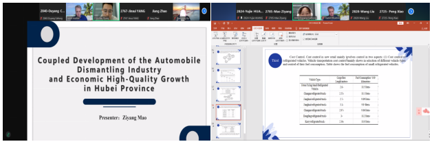 会上,公司研究生毛子阳作了题为“Coupled Development of the Automobile Dismantling Industry and Economic High-Quality Growth in Hubei Province”的报告。该报告通过分析湖北省汽车拆解产业与经济高质量增长的动态耦合机制,提出了促进产业升级和循环经济的策略。研究生欧阳彩虹作了题为“Optimization Analysis of Cold Chain Logistics Distribution for Fresh Agricultural Products under the New Retail Background”的报告。该报告针对新零售背景下农产品冷链物流配送的优化问题,提出了创新的优化模型和算法,旨在提升农产品供应链的效率和降低物流成本。