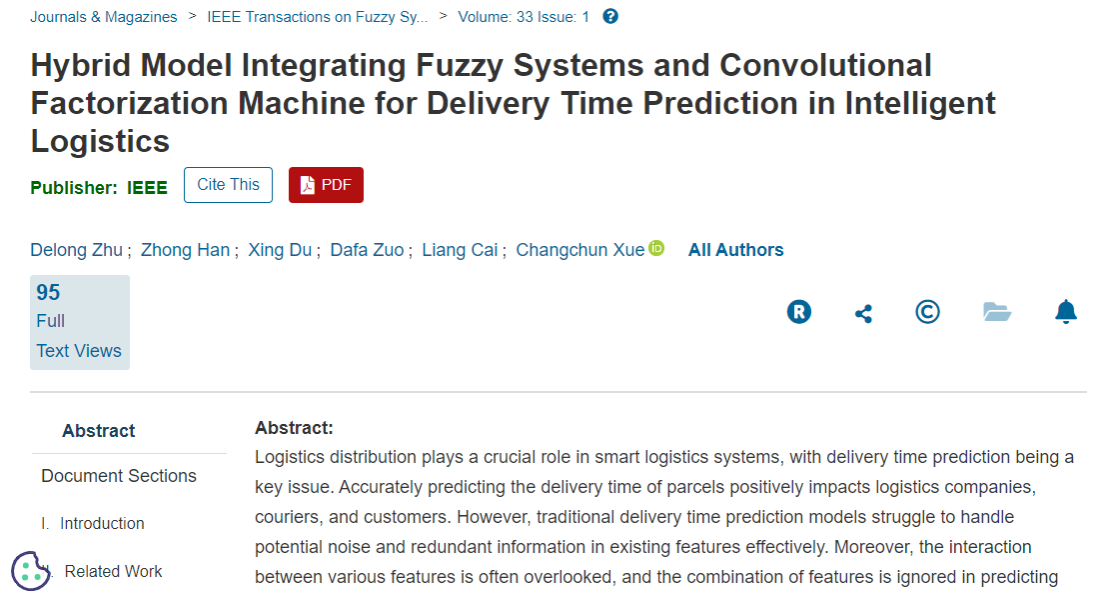 近日,公司6686朱德龙教授以第一作者身份携带其指导的本校2023级管理科学与工程专业硕士研究生杜星和2023级物流管理与工程专业左大发,在模糊系统理论领域国际顶级期刊 IEEE Transactions on FuzzySystems (IF=10.7,中国科学院SCI计算机科学大类1区TOP期刊)上发表题为 Hybrid Model Integrating Fuzzy Systems and Convolutional Factorization Machine for Delivery Time Prediction in Intelligent Logistics 的研究论文。6686体育为第一署名单位,6686薛昌春老师为本文通讯作者。该研究是6686“智慧物流与供应链产业链”团队的阶段性成果。